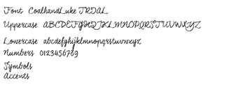 Coalhand Luke เป็นฟอนต์ที่ออกแบบด้วยมือสำหรับ Windows ซึ่งมีความสวยงามแบบชนบทและวินเทจ ด้วยขอบที่มีลักษณะเป็นเนื้อสัมผัสและการไหลที่เป็นธรรมชาติ ฟอนต์นี้เหมาะสำหรับโครงการที่ต้องการสัมผัสที่เป็นส่วนตัวและทำด้วยมือ รูปแบบตัวอักษรที่เป็นเอกลักษณ์และเส้นที่ละเอียดช่วยเสริมให้ฟอนต์นี้มีความรู้สึกที่ทำด้วยมือ ทำให้เหมาะสำหรับการใช้งานที่หลากหลาย เช่น การ์ดเชิญ บรรจุภัณฑ์ โลโก้ และการสร้างแบรนด์ในร้านบูติก บุคลิกที่เล่นสนุกแต่มีความสง่างามของฟอนต์นี้ทำให้สามารถกระตุ้นความรู้สึกของความคิดถึง เหมาะสำหรับความพยายามสร้างสรรค์ที่มุ่งหวังที่จะเชื่อมโยงกับผู้ชมในระดับอารมณ์
